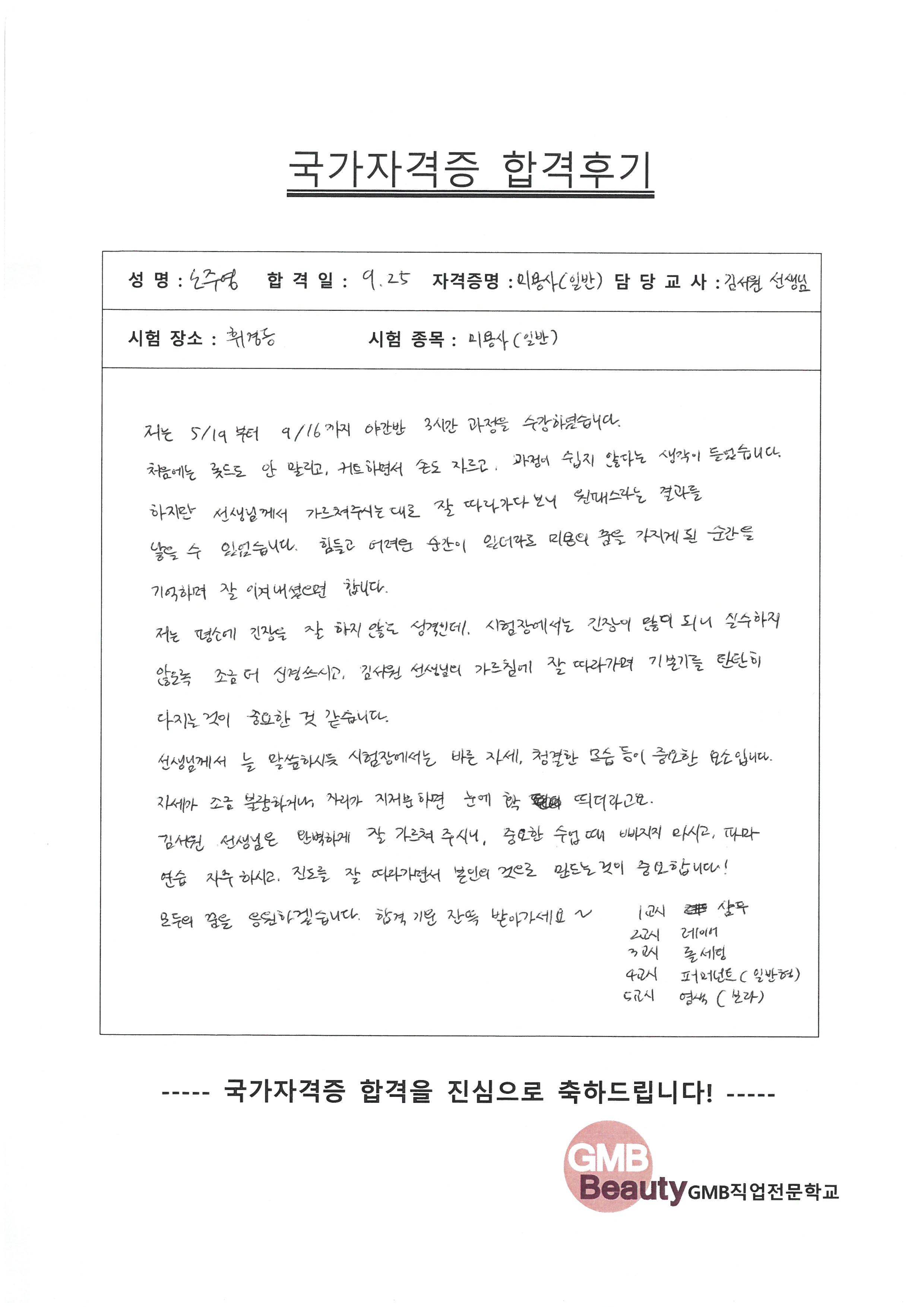 야간 실기반으로 헤어자격증 원패스 취득 했어요~(김서원 선생님 감사합니다.)