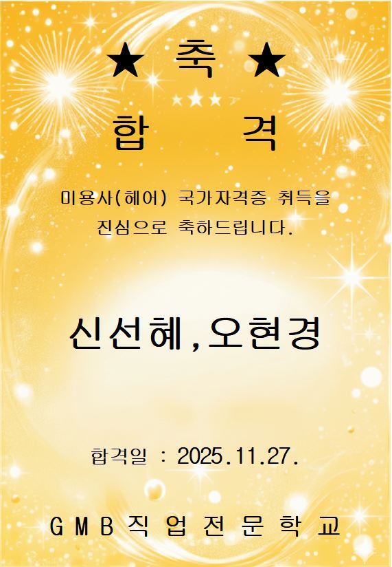 헤어미용사 국가자격증 취득 축하드려요~