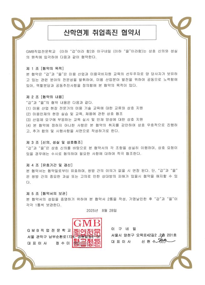 【이구네일】과 【GMB직업전문학교】산학연계 취업촉진 협약서 체결하였습니다.