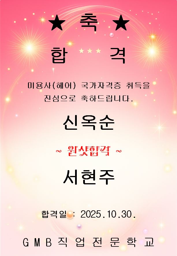 헤어미용사 국가자격증 취득 축하드려요~