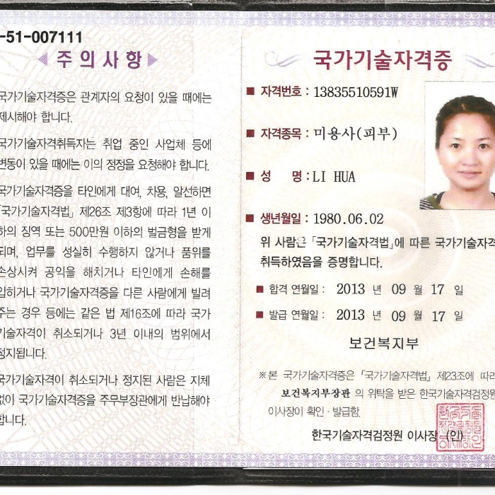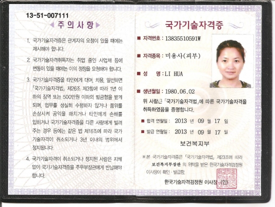 재외동포 "리화"씨가 피부미용 국가자격증을 취득 하셨어요~