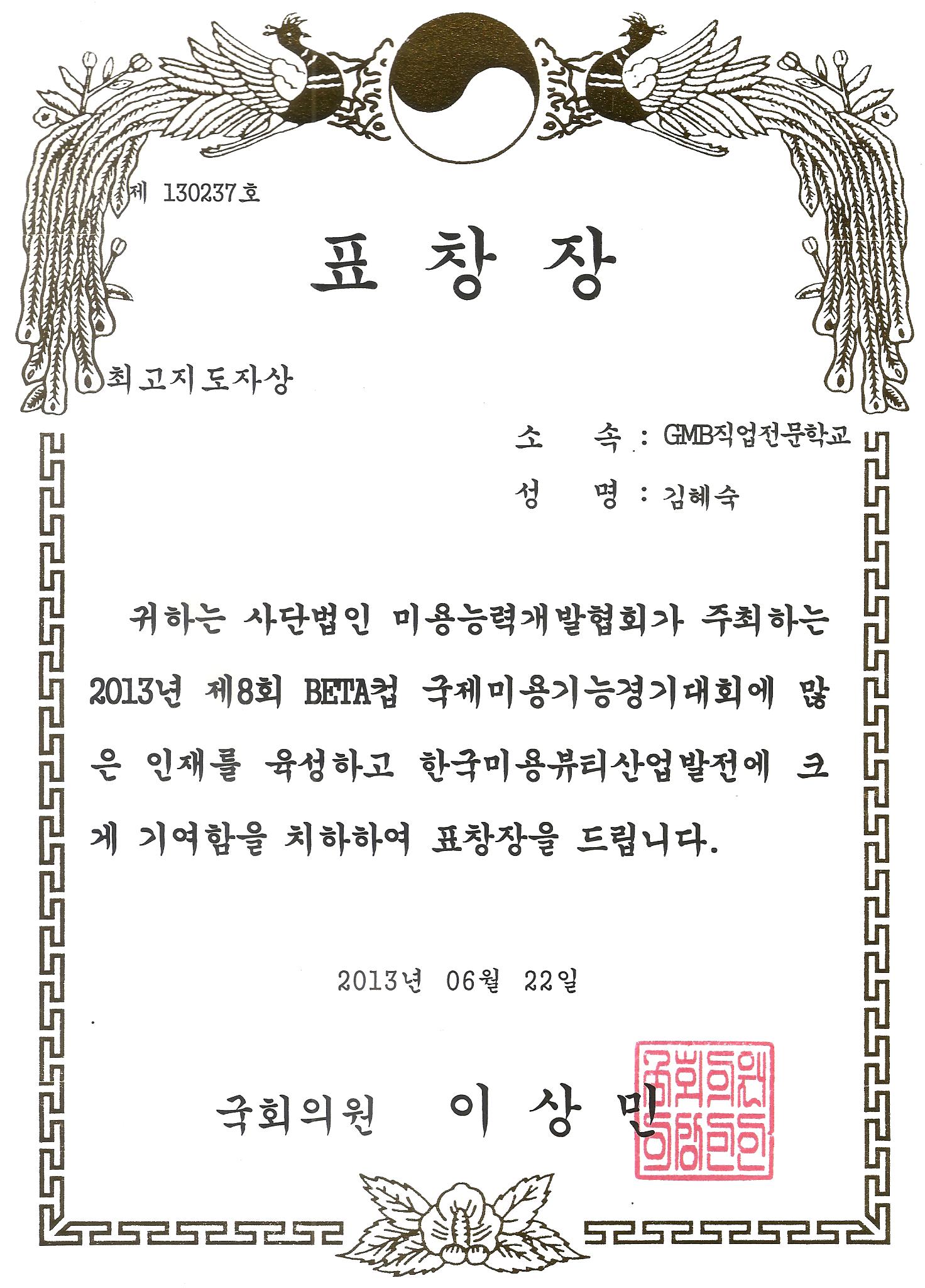 2014 베타컵 미용기능 경기대회에서 학생들을 지도한 공으로