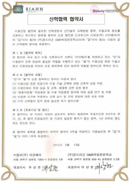 리안헤어(대표 유상준)와 GMB직업전문학교(대표 이상헌)는